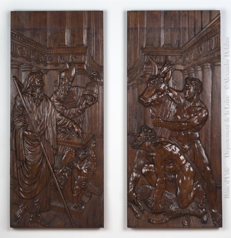Bas-reliefs représentant un sacrifice selon l'ancienne loi : sur le vantail de gauche, le grand-prêtre d'Israël, assisté d'un personnage vêtu à l'antique, tenant une sorte de bâton augural, fait une libation ; sur celui de droite, deux personnages nus présentent au sacrifice un boeuf et un agneau déjà égorgé ; au-dessous de cette scène, des anneaux chargés de triangles inscrits dans des écussons.