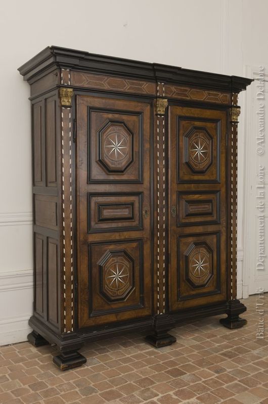 Armoire italienne en noyer et ébène à deux vantaux compartimentés en trois avec incrustations en ivoire et chapiteaux en bois doré