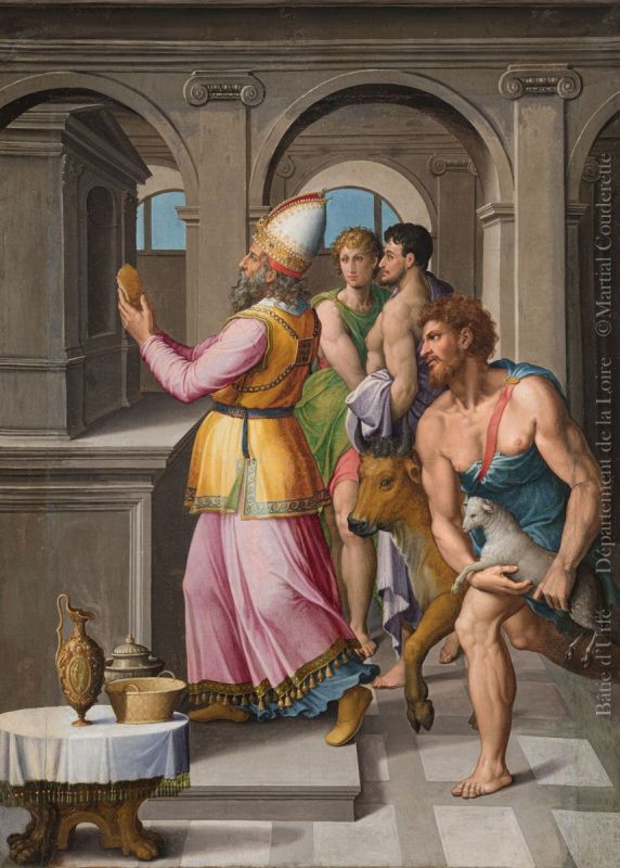 Tableau représentant Melchisédech offrant le pain et le vin à Dieu. Devant un autel, un prêtre, debout, lève vers le ciel les yeux et les main, en tenant un morceau de pain. Des animaux sont sur la droite.