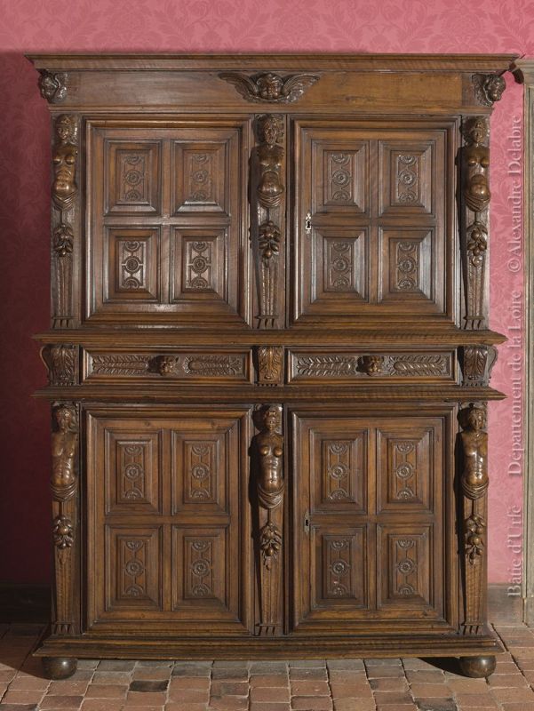 Buffet à deux corps, séparés par un rang de tiroirs. Il ouvre par deux vantaux, juxtaposés par corps, séparés par un faux dormant. Il est surmonté d'une frise sculptée et d'une corniche débordant faiblement le bâti. Le buffet repose sur des pieds miches. Les flancs sont à bâti à membrure. Chacun des quatre vantaux présente quatre petits panneaux moulurés à décor de rosaces en faible relief. Les montants et faux dormants sont sculptés de cariatides en gainées décorés d'une chute de fruits; les visages sont différents. Les deux tiroirs sont décorés de pistils encadrant une prise en forme de tâte fantastique, tiroirs et vantaux latéraux sont flanqués de console. La frise est ornée de trois tête d'angelots ailés. Ls panneaux des côtés sont à larges rosaces et les montants sont sculptés de plumes.
