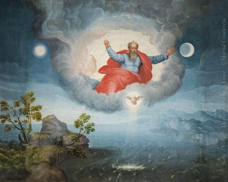 Troisième tableau à droite de l'autel, parallèlement à l'autel, dans l'embrasure de la fenêtre. Dieu est représenté, au centre du tableau, les bras étendus, entouré d'un halo lumineux. A sa droite, le soleil; à sa gauche, la lune. Dans l'angle gauche, en bas du tableau: quelques plantes.
